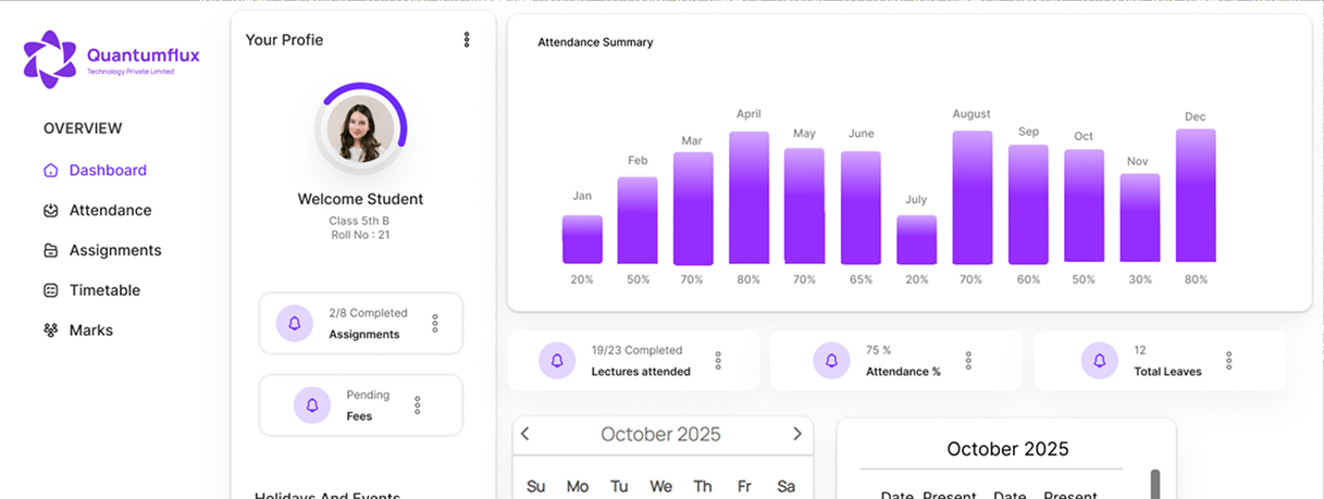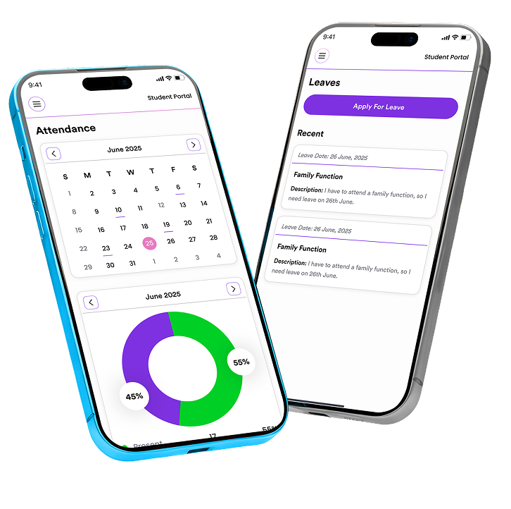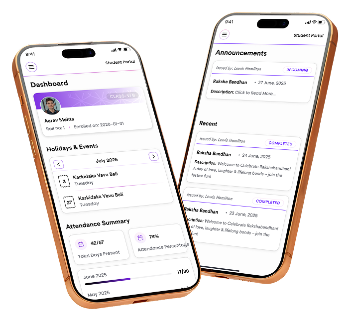 Manage admissions, attendance, exams, fees, and communication through a centralized school management system with a dedicated mobile app.